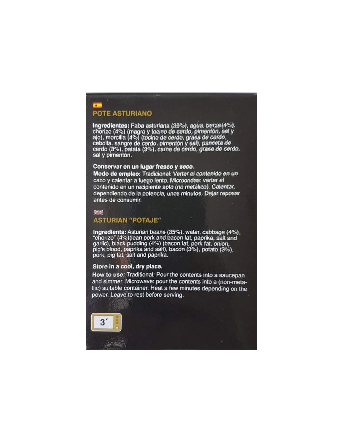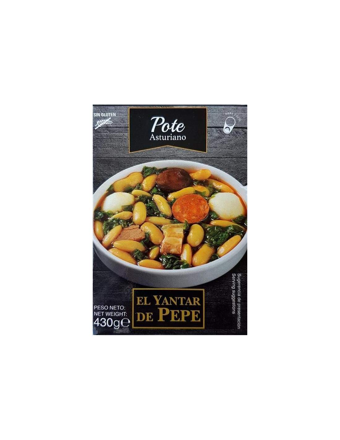 El Pote asturiano est un ragoût typique des Asturies à base de Fabres des Asturies, de choux, de pommes de terre et de compango (chorizo asturien, boudin noir asturien et lard ibérique). L’identité de qui est déterminée par le goût du légume, légèrement acide. Boîte de présentation de 430 grs.