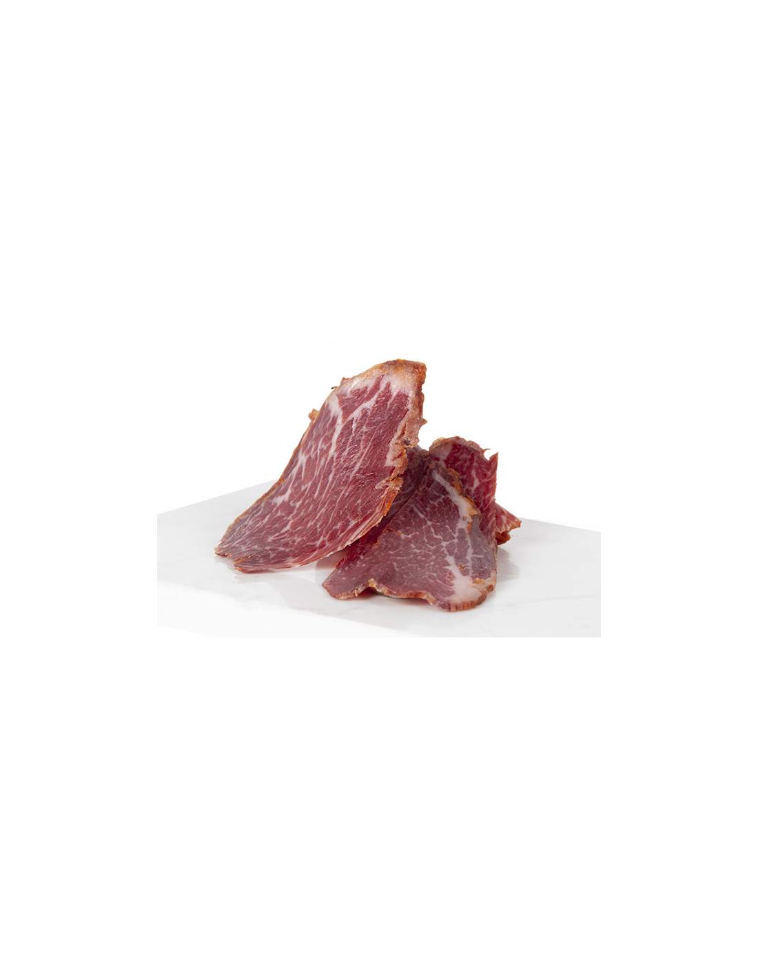 Da maiale iberico nutrito in campo con mangimi naturali, ghiande e erbe fresche. Fatto a mano in essiccatori naturali. Indurito per un minimo di 2 o 3 mesi in modo lento, lasciando un aroma tenero, venato e senza pari.