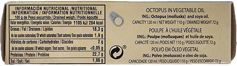 Ingredienti: Polpo (molluschi) e olio di soia.