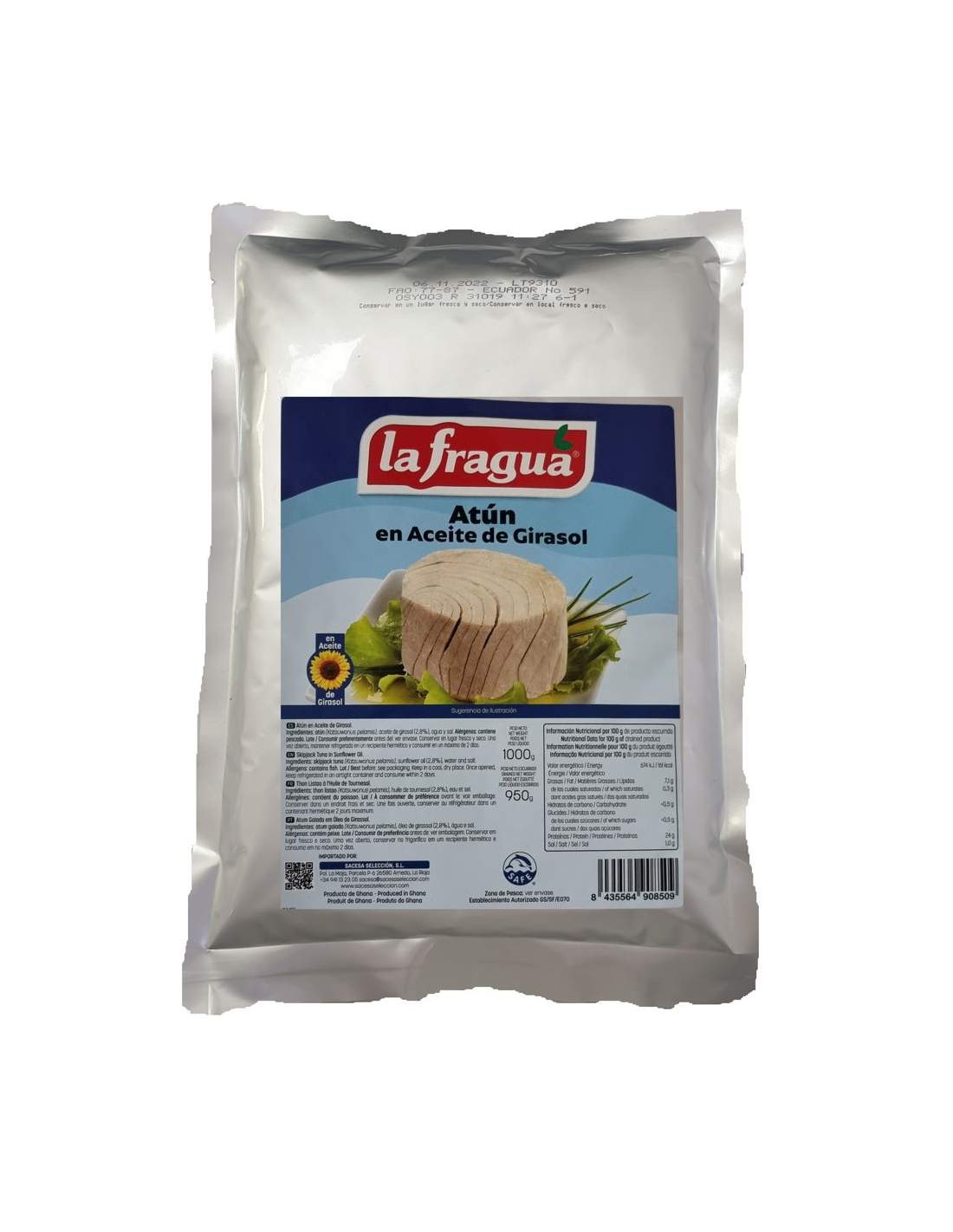Ingredientes: Atún (93%) , aceite de girasol (3%) y sal (2%)