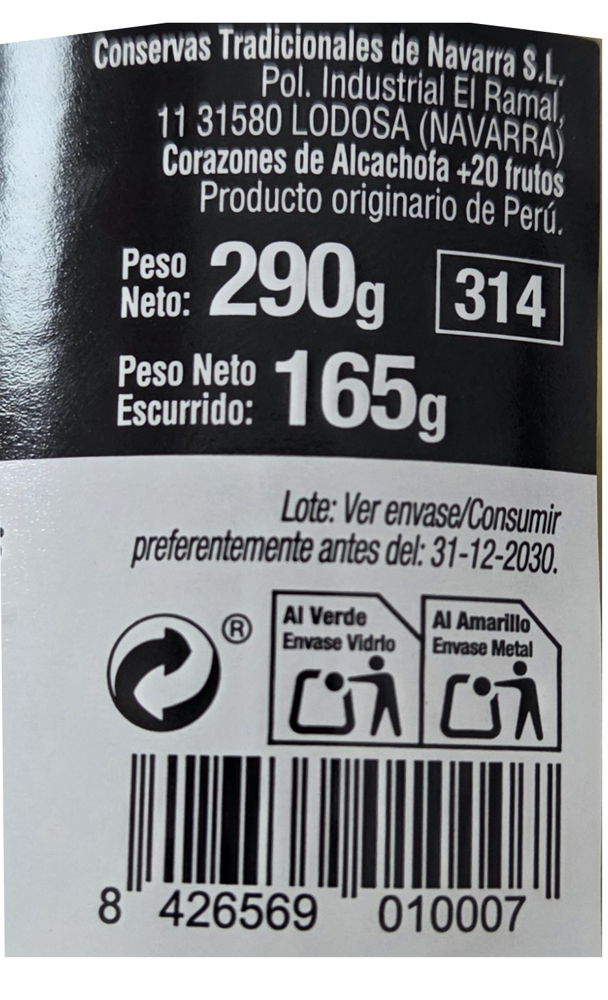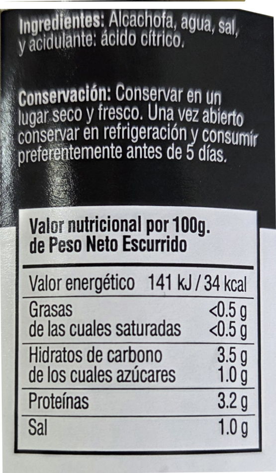 Ingredientes: Alcachofa, agua, sal y acidulante: ácido cítrico.