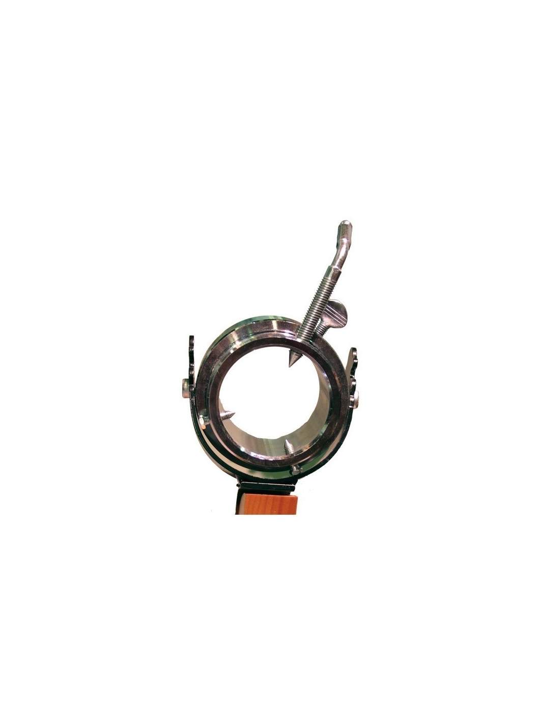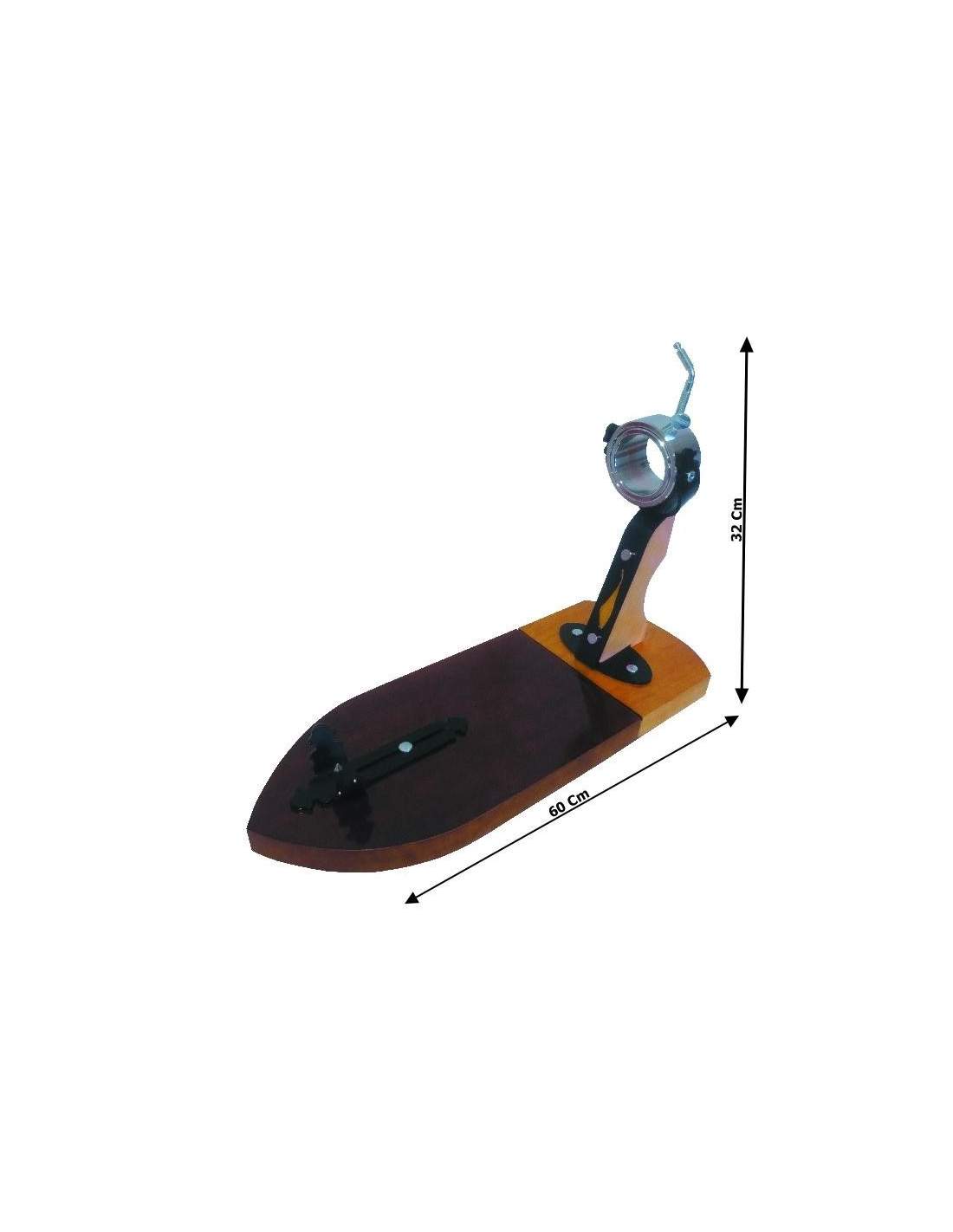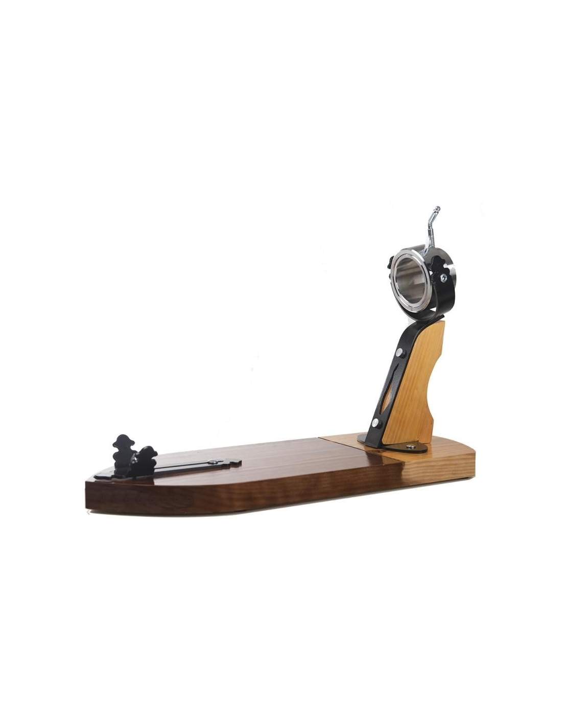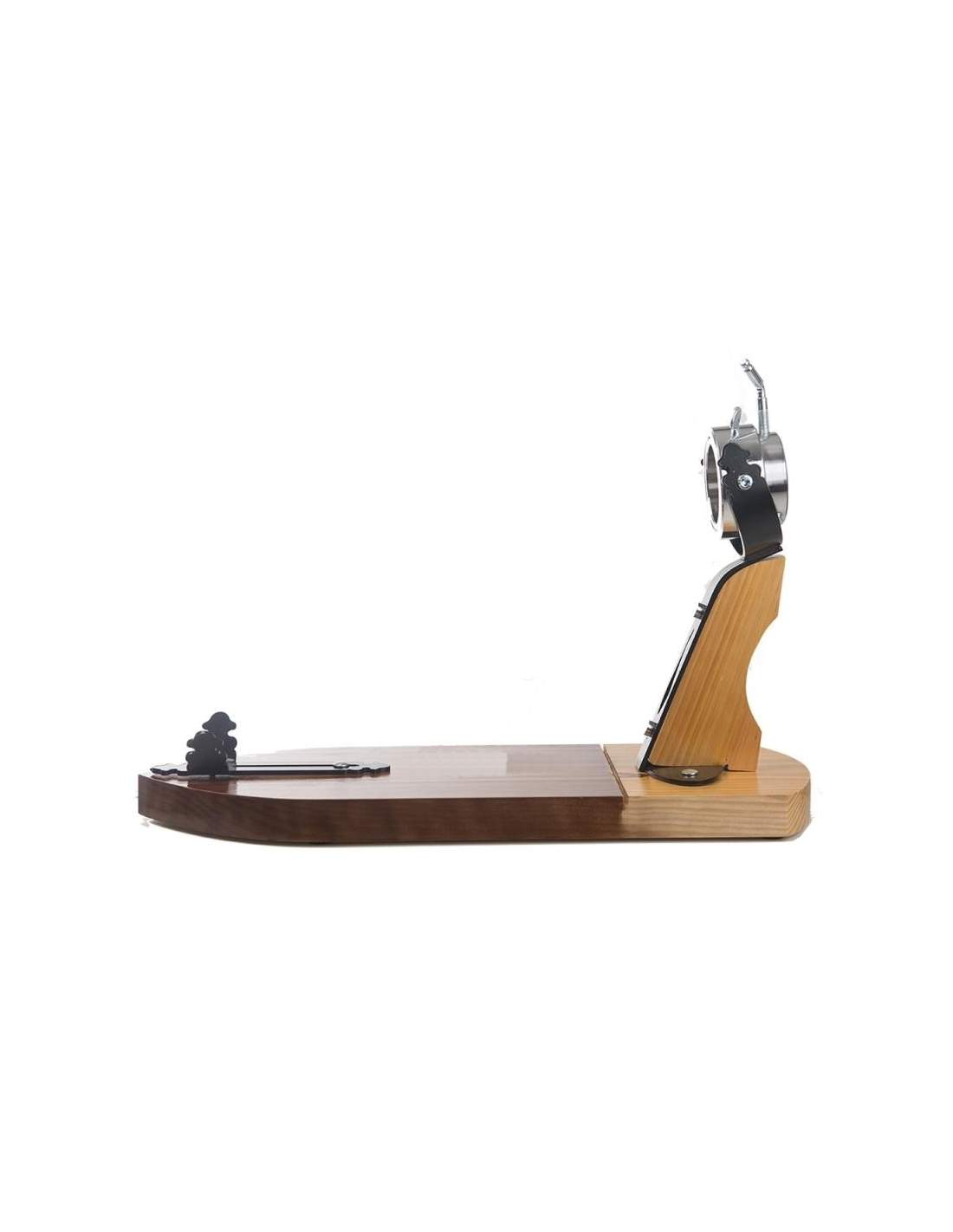 Soporte jamonero con base con forma de bellota lacada en dos colores. Los herrajes vienen acabados en pintura termolacada, menos el casquillo giratorio que va cromado, Incluye “v” corredera que se puede fijar en varias posiciones, según el tamaño del jamón.