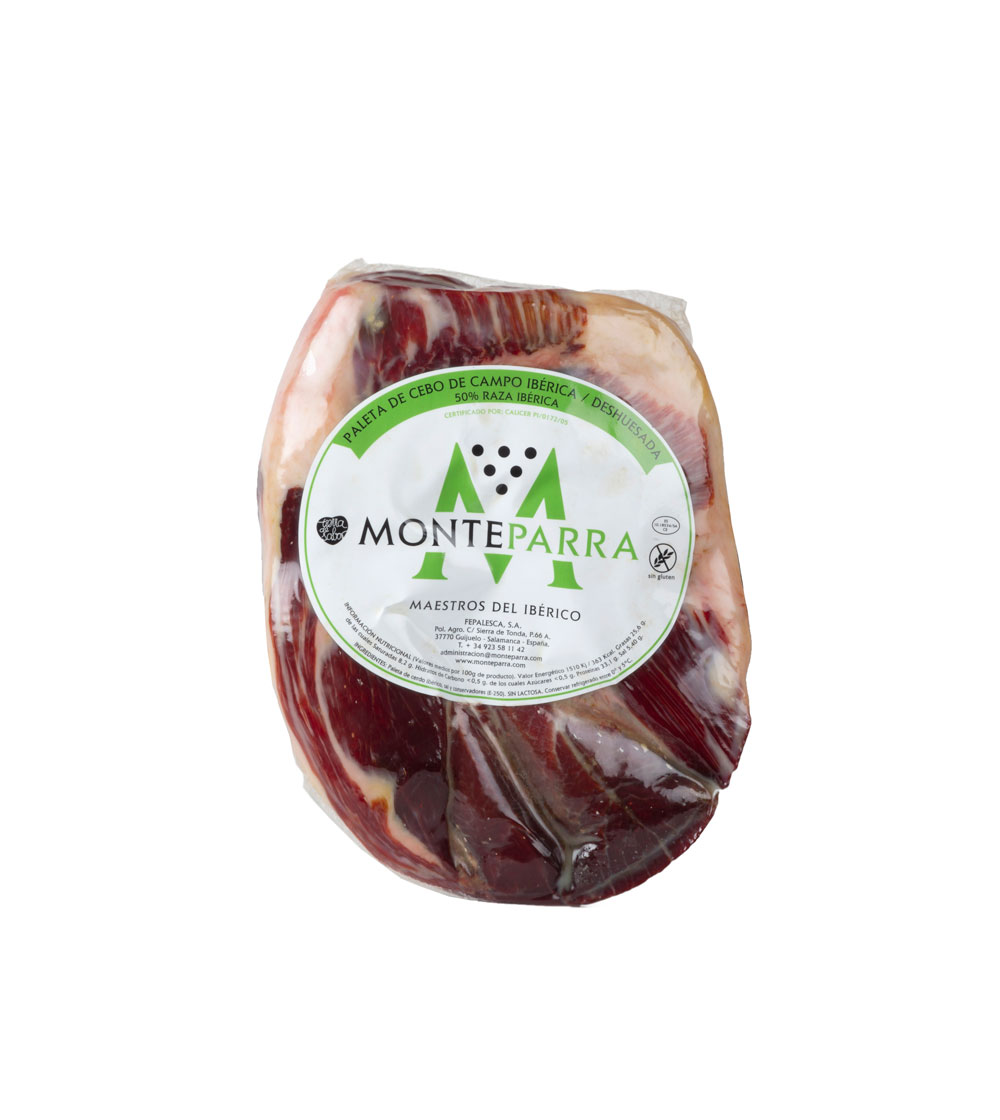 Paleta de cebo campo 50% ibérico Monteparra 5-5,5 Kg. aprox. Procedente de cerdos ibéricos criados en el campo a base de piensos de alta calidad a base de cereales, pastos y bellotas. Cerdos criados en cercas en libertad. Elaborado y curado en Guijuelo (Salamanca) en secaderos naturales dan lugar a un producto saludable y sabroso.