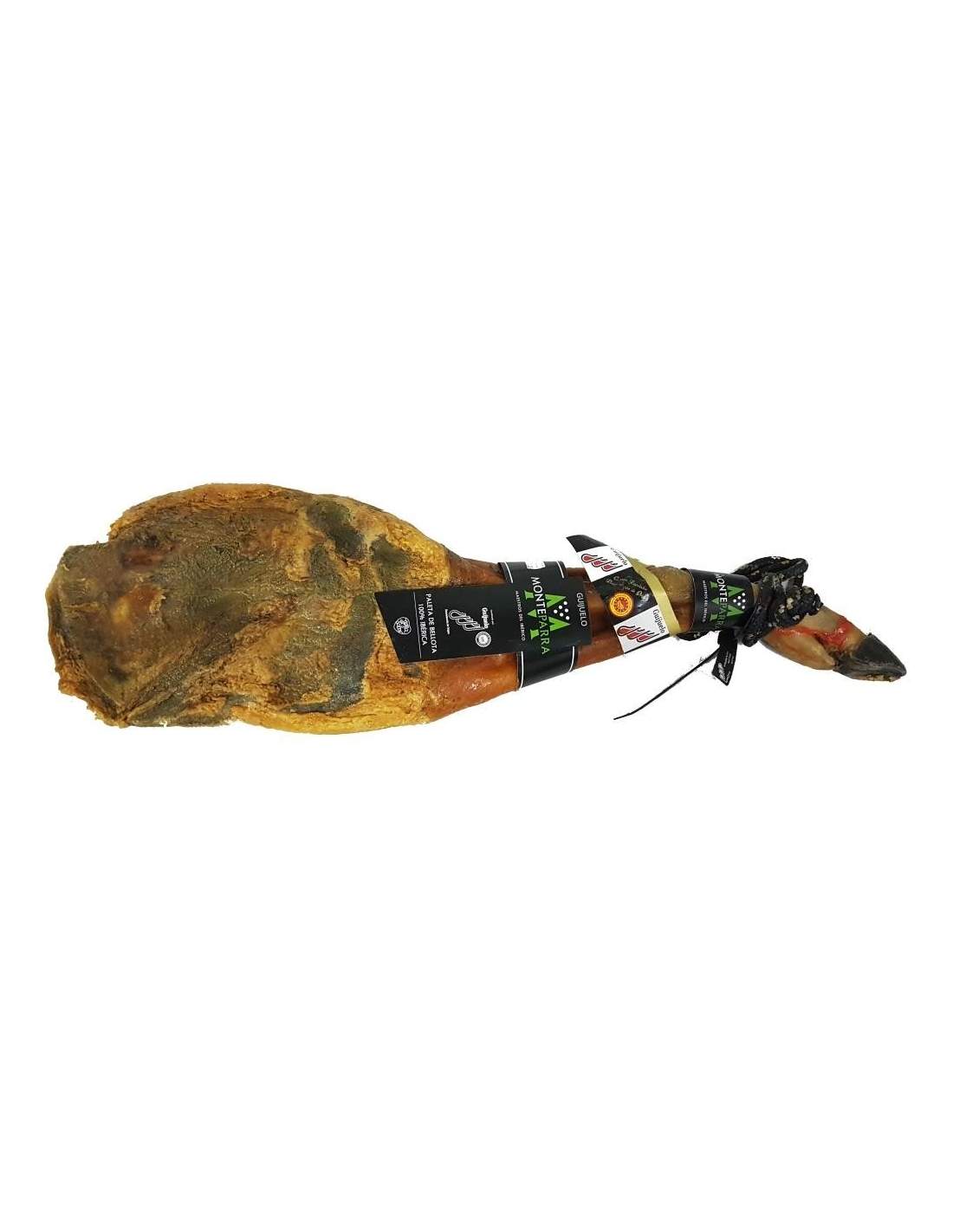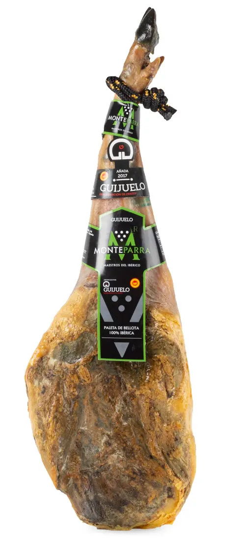 Paleta de bellota 100% ibérico D.O. Guijuelo La gran mayoría de criadores trabaja con cerdos ibéricos de raza mixta, fruto de la unión entre cerdos de raza ibérica pura y cerdos de raza Duroc. Son seleccionados por su mayor productividad pero dan lugar a sabores y aromas distintos a los del cerdo 100% ibérico. Monteparra ha seleccionado, ejemplares de pura raza ibérica y cuenta con un equipo de veterinarios y técnicos agropecuarios que se dedica exclusivamente al estudio, cuidado y control del animal: el cerdo 100% ibérico. El etiquetaje negro avala el producto como 100% Ibérico de Bellota y, por lo tanto es también una garantía de excelencia y calidad. Solo los productos marcados con la etiqueta negra pueden ser llamados pata negra.